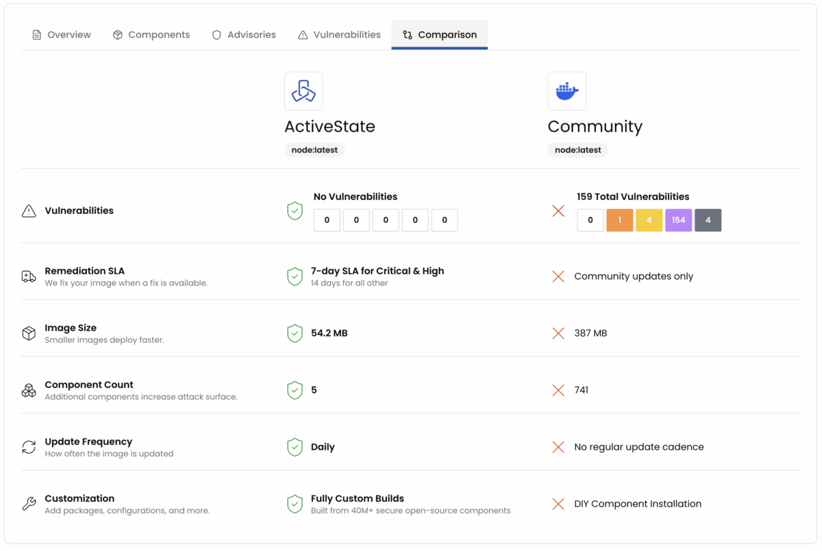 But here’s where it gets even better: the catalog displays ActiveState images alongside their community-maintained counterparts, allowing you to instantly compare security postures, component lists, and vulnerability profiles side by side.