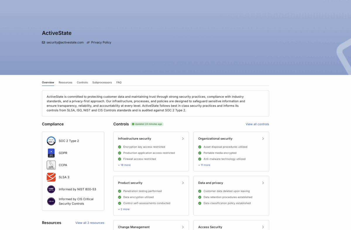 Ready to explore the ActiveState Trust Center? We invite you to explore and see how ActiveState’s commitment to security and compliance can support your organization’s goals. As we evolve, so too will the Trust Center, ensuring it remains a valuable resource for understanding how ActiveState provides data security. Our team will regularly update the platform with any new certifications, updates, or additional resources.